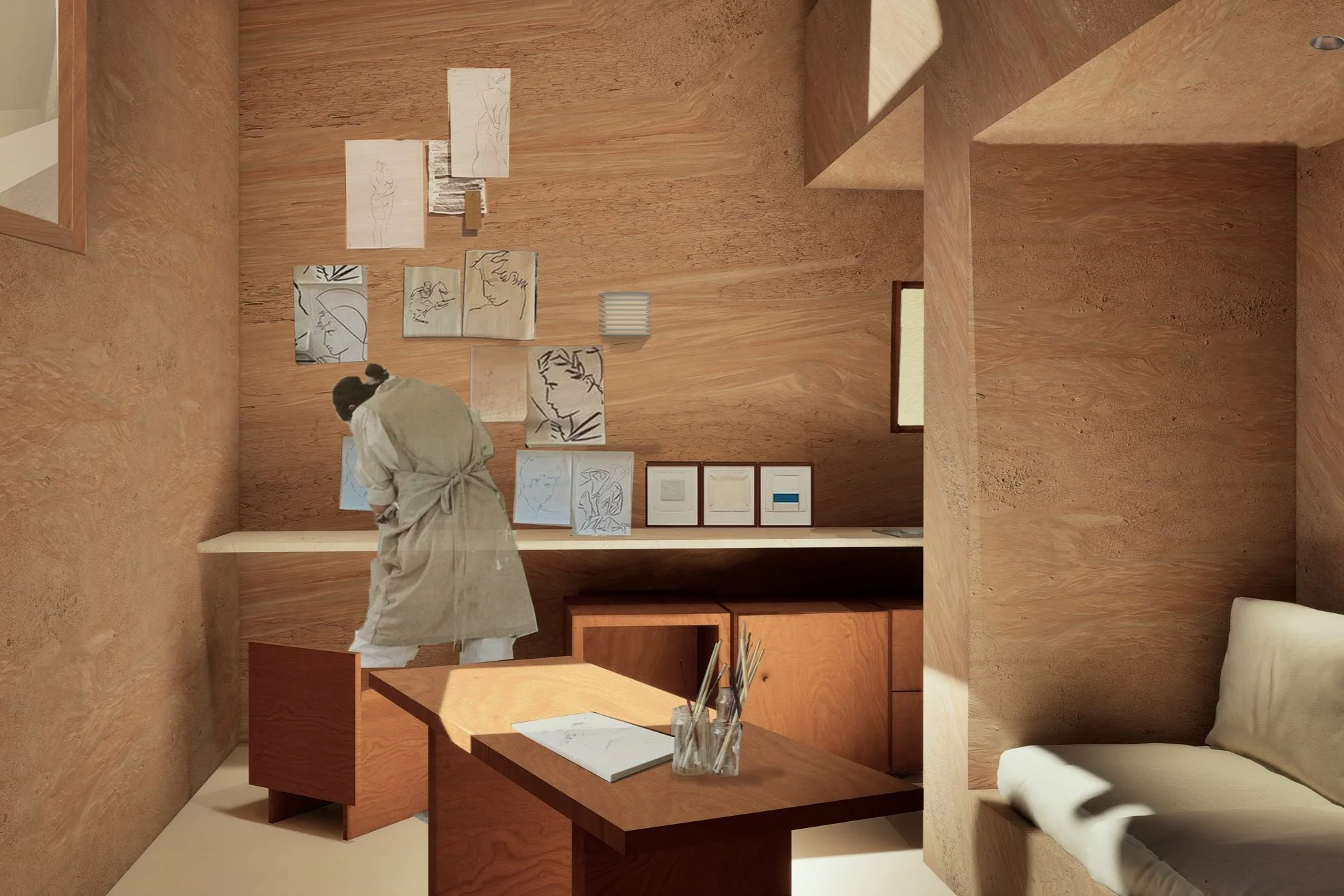 A través de la unidad más esencial, el cuadrado, que daba forma a los claustros surgen estas tres unidades de viviendas mínimas completas pensadas para despertar la inspiración y facilitar sus procesos de creación.